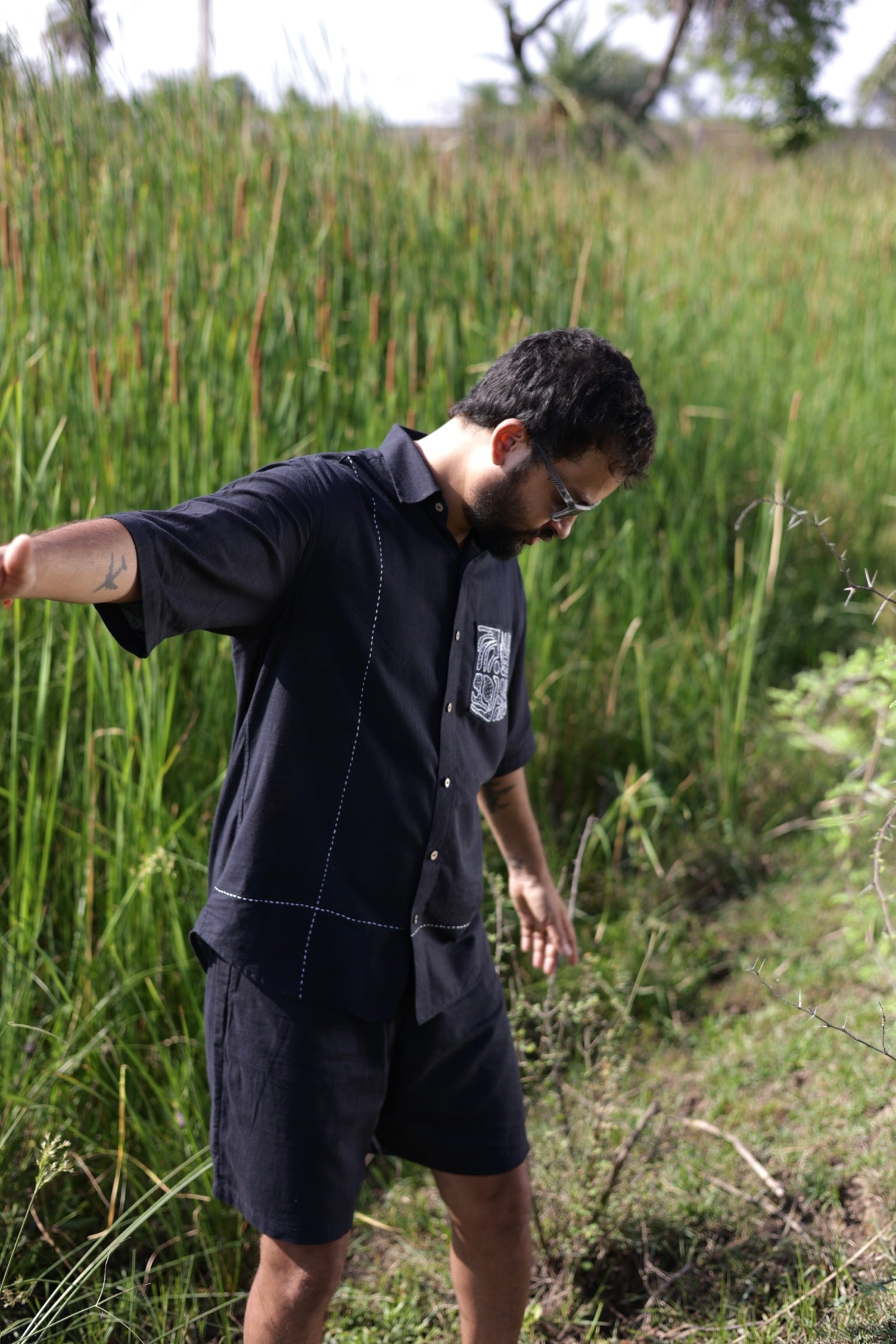 A relaxed black shirt elevated with hand-stitched white embroidery on the pocket and fine running stitches across the front. Cut from breathable cotton, it’s designed with a laid-back fit, half sleeves, and natural wood buttons. The embroidery adds a subtle artisanal touch, making it easy to style for both casual days and evenings out.
