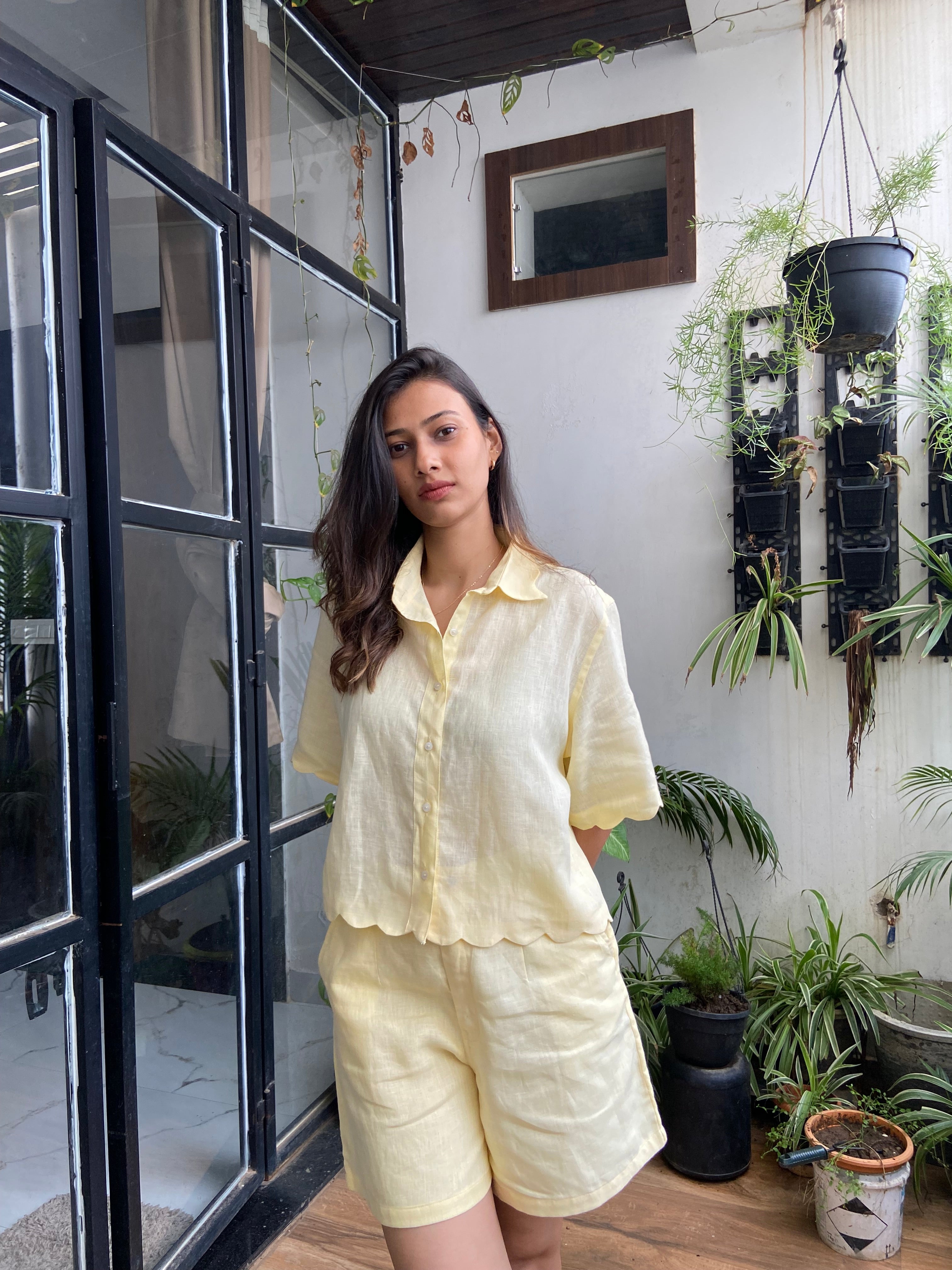 A light and airy co-ord in soft butter linen, featuring a relaxed button-down shirt with scalloped collar, sleeves, and hem, paired with easy-fit high-waist shorts. Designed for comfort and effortless style- perfect for brunch, travel, or laid-back days.