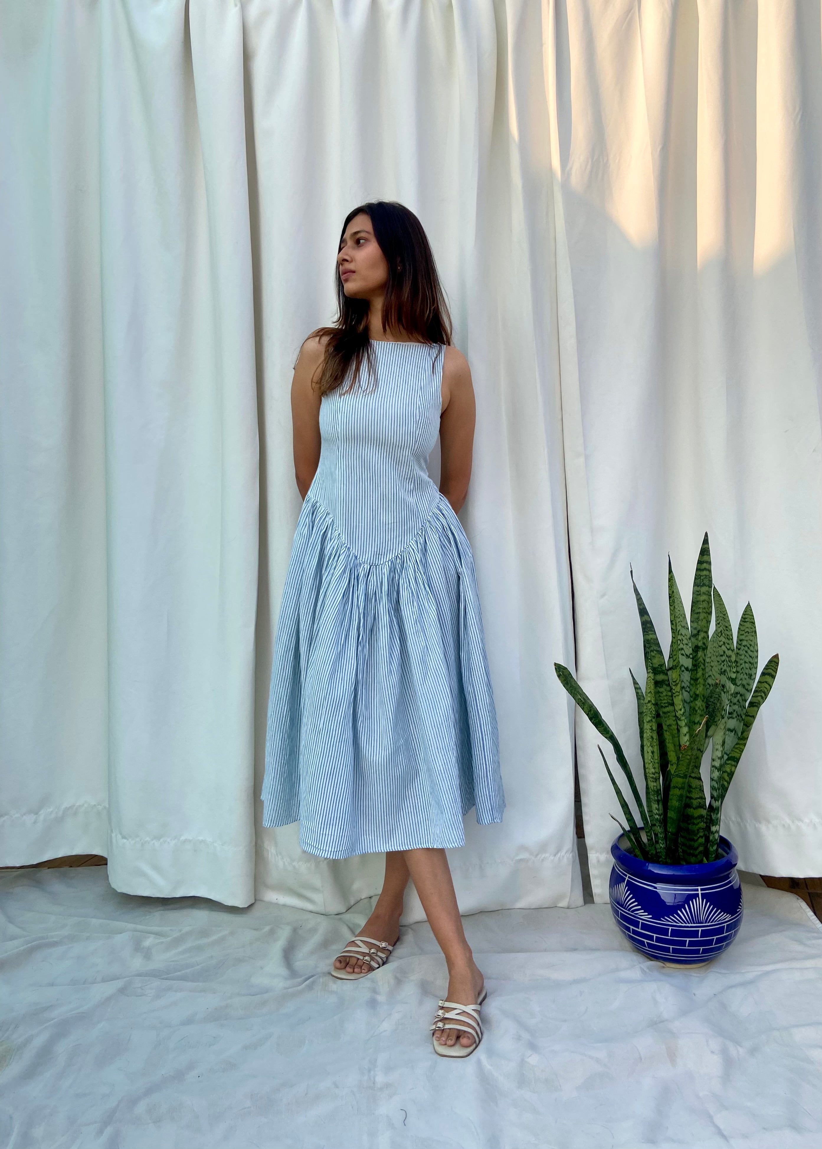 A playful take on stripes, this dress is crafted in pure cotton with a shaped waist that flows into soft gathers. The sleeveless cut and clean neckline keep it easy, while the smocked back gives a flexible, comfortable fit.