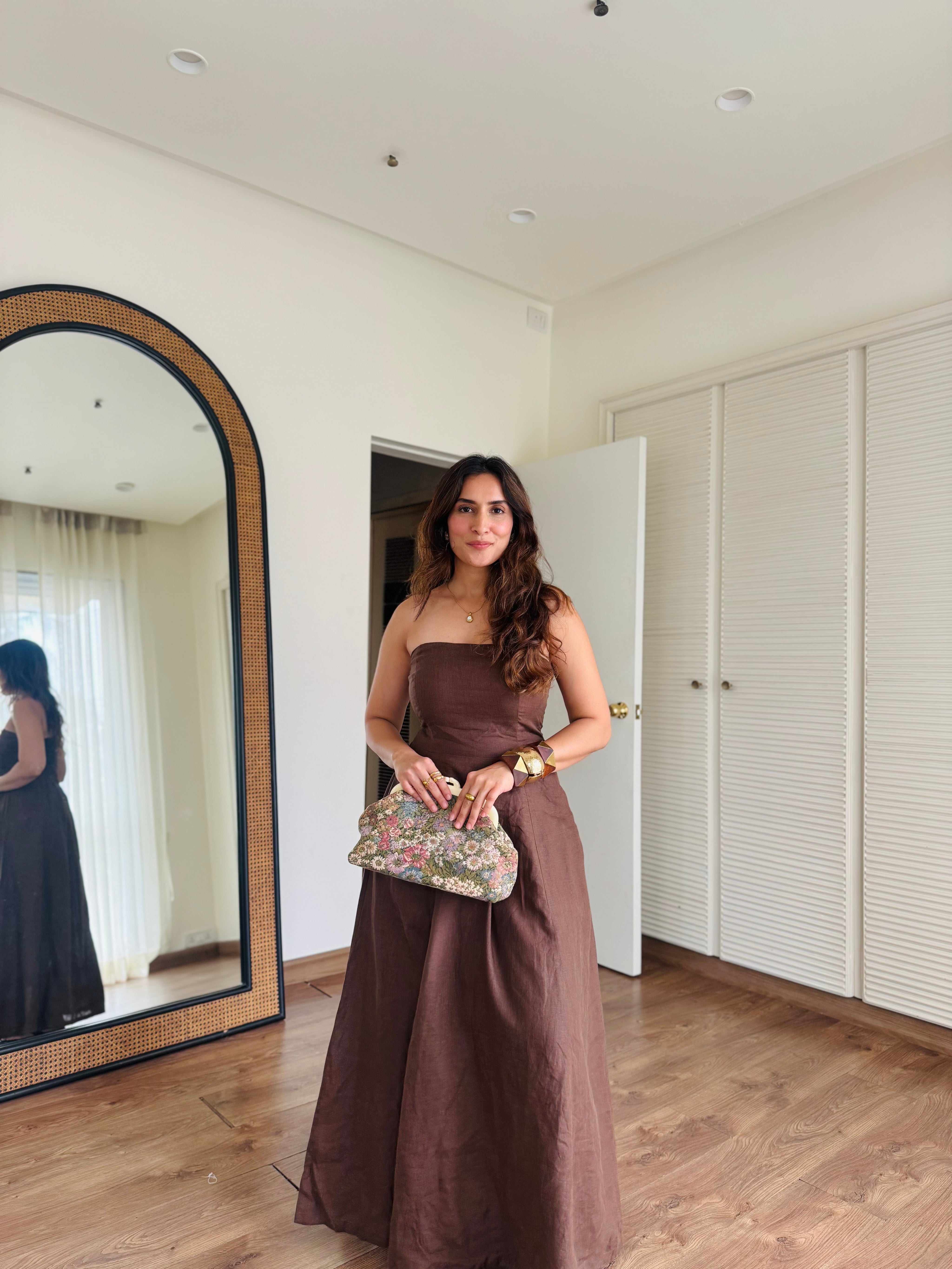 A sleek strapless maxi in an earthy brown tone, designed with a clean A-line fall. The smocked back ensures comfort and a secure fit while keeping the front minimal and structured. Perfect for days you want ease with just the right amount of elegance.